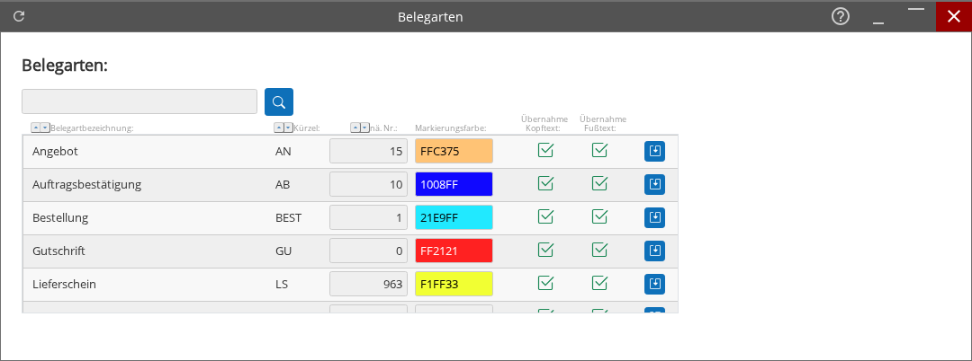 - Aktualisieren der Liste – lädt die aktuellen Belegartdaten und Einstellungen neu