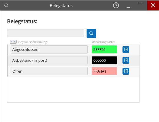 Die Maske ermöglicht die Verwaltung von Belegstatus und deren visueller Kennzeichnung. Anwender können Statusbezeichnungen pflegen, nach Statuseinträgen suchen und für jeden Status eine Markierungsfarbe festlegen, um die Erkennung im System zu erleichtern.