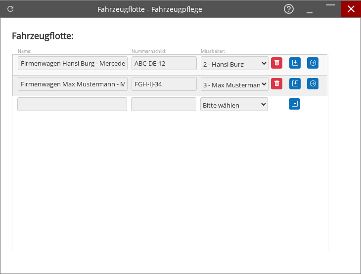Die Maske dient der Verwaltung der Fahrzeugflotte und ermöglicht das Anlegen, Zuordnen und Verwalten einzelner Fahrzeuge über die Felder Name, Nummernschild und Mitarbeiter. Einträge werden zeilenweise erfasst und pro Eintrag stehen spezifische Aktionen zur Bearbeitung und Verwaltung zur Verfügung.