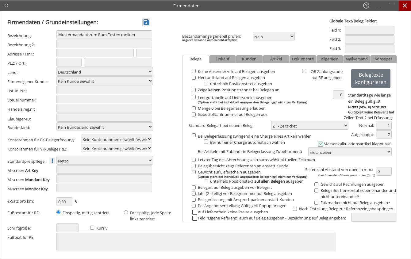 • Zeile Textfelder / globale Textfelder (z. B. re_fuss_text) – Felder zur Pflege von globalen oder belegbezogenen Textbausteinen.