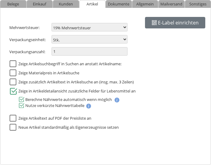 • Zeige in Artikeldetailansicht zusätzliche Felder für Lebensmittel an – Checkbox zur Anzeige lebensmittelrelevanter Zusatzfelder in der Artikeldetailansicht.