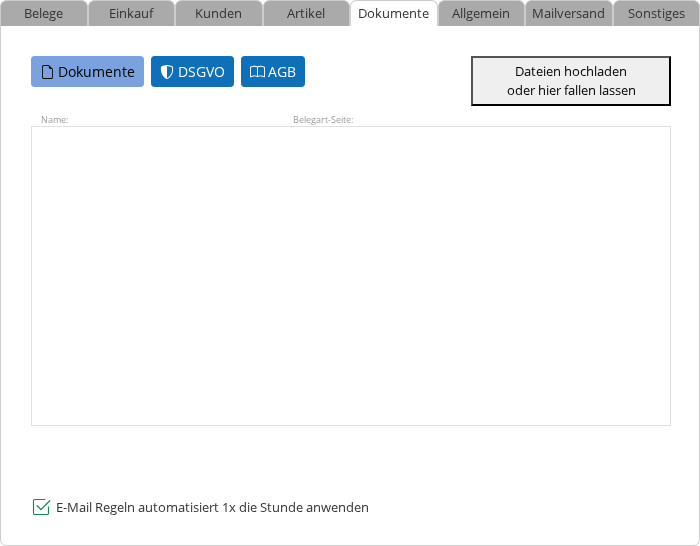 • Nutzen Sie die Aktionsbuttons zum Hochladen von Dateien, zur Konfiguration von Belegtexten oder zum Versenden einer Test-E-Mail.