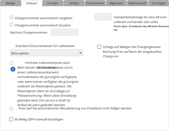 • EK-Beleg SEPA manuell bestätigen – Checkbox zur manuellen Bestätigung von SEPA-Zahlungen bei Einkaufsbelegen.
