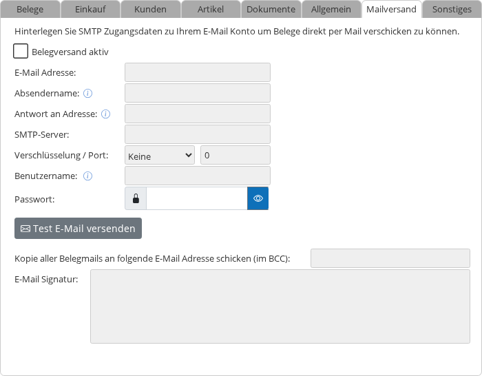 • Belegversand aktiv – Checkbox zur Aktivierung des elektronischen Belegversands.