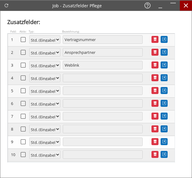 Am Ende jeder Zeile stehen Aktionsschaltflächen zur Verwaltung des jeweiligen Zusatzfelds.