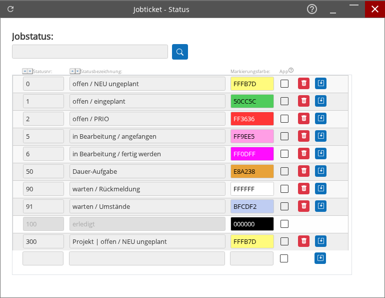 Die Maske dient zur Verwaltung von Jobstatus-Einträgen und ermöglicht das Anlegen, Bearbeiten sowie Kennzeichnen von Statusinformationen. Statuseinträge werden in einer Listenansicht mit einzelnen Zeilen pro Status dargestellt und können über Suchfunktionen sowie Aktionsschaltflächen gezielt gefiltert und bearbeitet werden. Zu jedem Status können eine Statusnummer, eine Bezeichnung, eine Markierungsfarbe und eine App-Zuordnung verwaltet werden.
