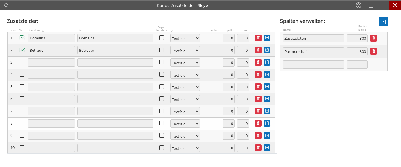 - Der Arbeitsbereich listet alle definierten Zusatzfelder in Zeilen auf und zeigt die Spalten Feld:, Bezeichnung:, Aktiv:, Typ:, Checkbox:, Zeige, Zeilen:, Titel:, Spalte: und Pos.: an.