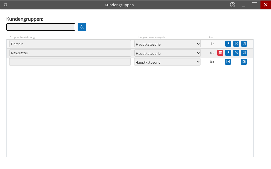 - Löschen (Papierkorb-Symbol) – entfernt die ausgewählte Kundengruppe aus der Liste