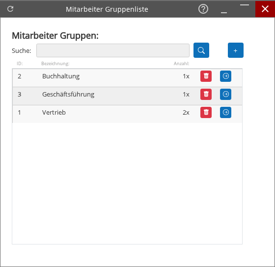 - Plus-Schaltfläche (+) – öffnet die Maske zur Anlage einer neuen Mitarbeitergruppe