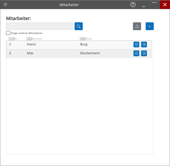 - Anlegen neuer Mitarbeiter über die Plus-Schaltfläche und Import von Datensätzen über die Upload-Schaltfläche.