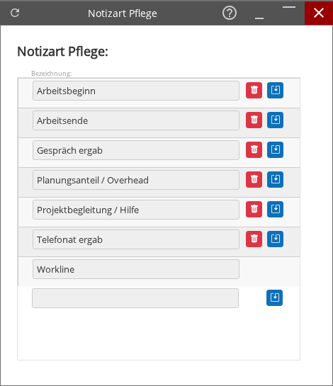 Die Maske dient zur Pflege von Notizarten und ermöglicht das Anlegen, Bearbeiten, Löschen und Verwalten von Bezeichnungen. Einträge werden direkt in der Liste bearbeitet und können über vorhandene Schaltflächen pro Zeile administriert werden.
