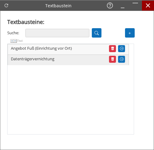 - Textbausteine: – Überschrift der Maske, die den Inhalt der Maske als Verwaltung von Textbausteinen kennzeichnet.